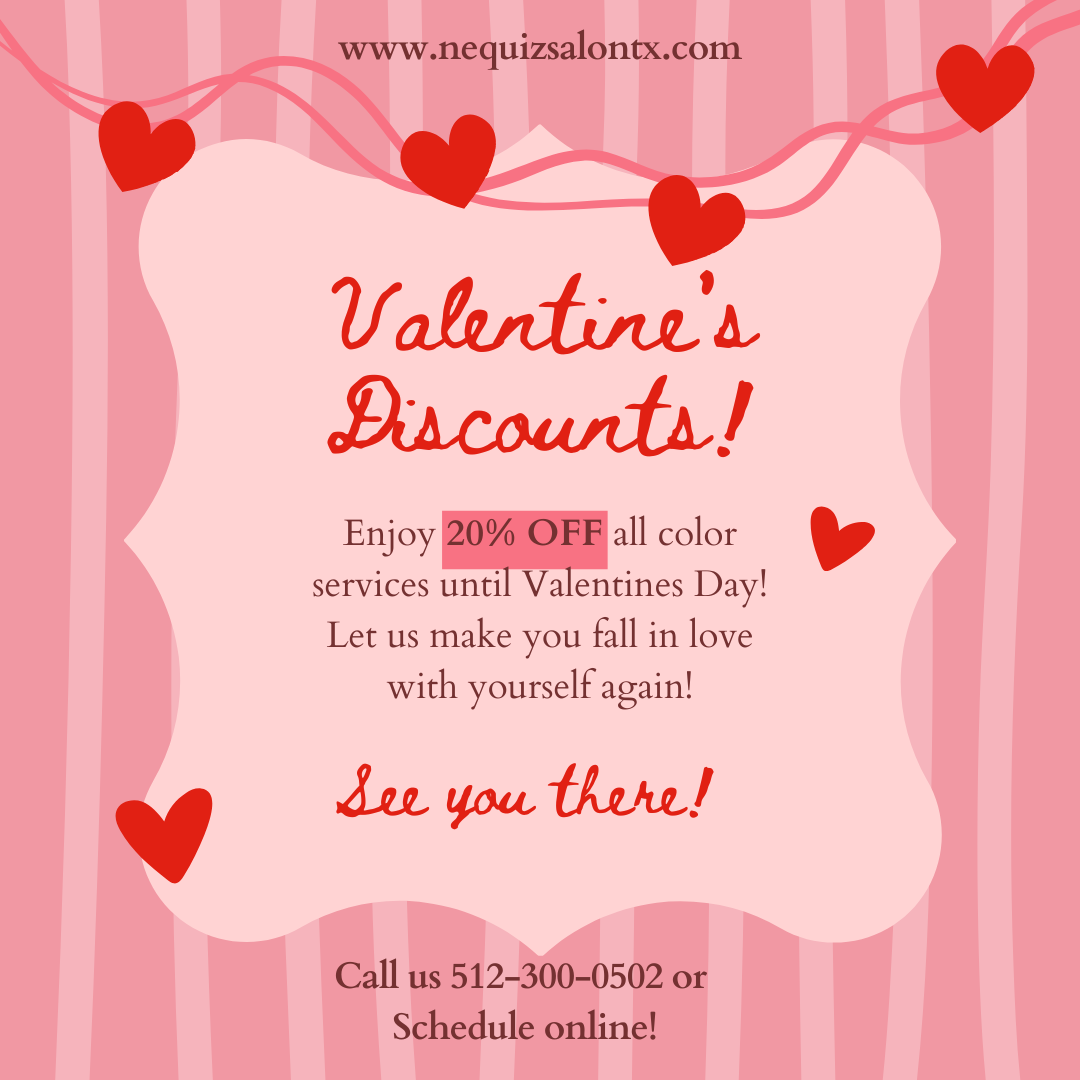 We are offering a 20% OFF discount for all our beautiful color clients! Schedule your appointment online or give us a call to take advantage of this great deal<3 Use PROMO CODE : Valentine’s Day